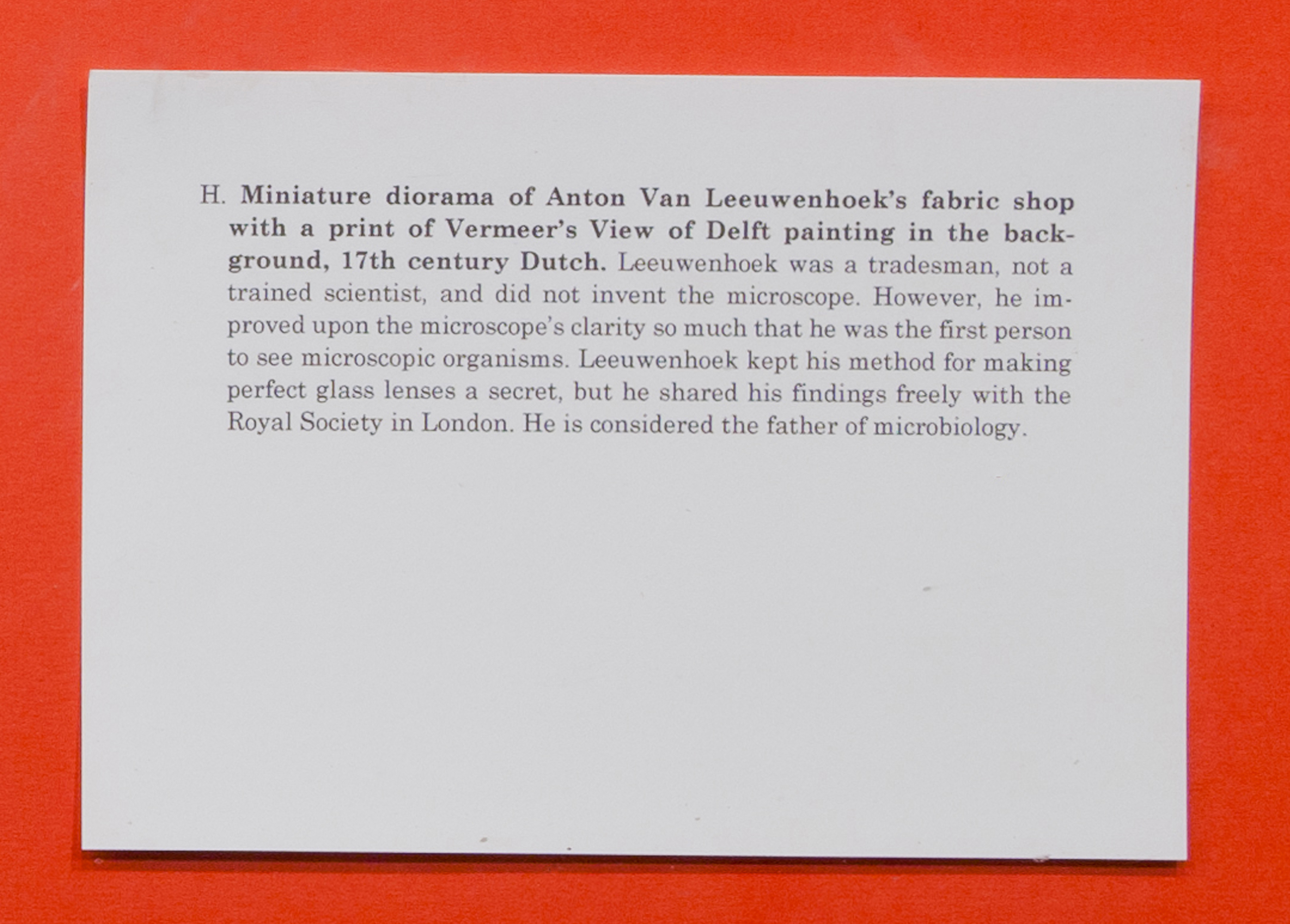 Microscope, petri dish, glass vials, moss, pencil sketches, hand-sewn stuffed water bear, Dr. Who TARDIS mug, gold mylar disc, carpet, furniture, descriptive text placards, chalk drawing of stars on paper; books: Micrographia, by Robert Hooke (1665), The Biology of Tardigrades, and The Philosophical Breakfast Club: Four Remarkable Friends Who Transformed Science and Changed the World by Laura J. Snyder; Article printouts: Foldscope schematic, vaccine technology and water bears; X-ray image of Alan Shepard’s Apollo 14 spacesuit and microscope image of a tardigrade; television with still image of Carl Sagan from Cosmos: A Personal Voyage (aired in 1980 on PBS); printed backdrop magnified from an illustration in Pond Life: A Golden Nature Guide (1967); wooden stand; plywood diorama box; miniature diorama of Anton Van Leeuwenhoek’s fabric shop.