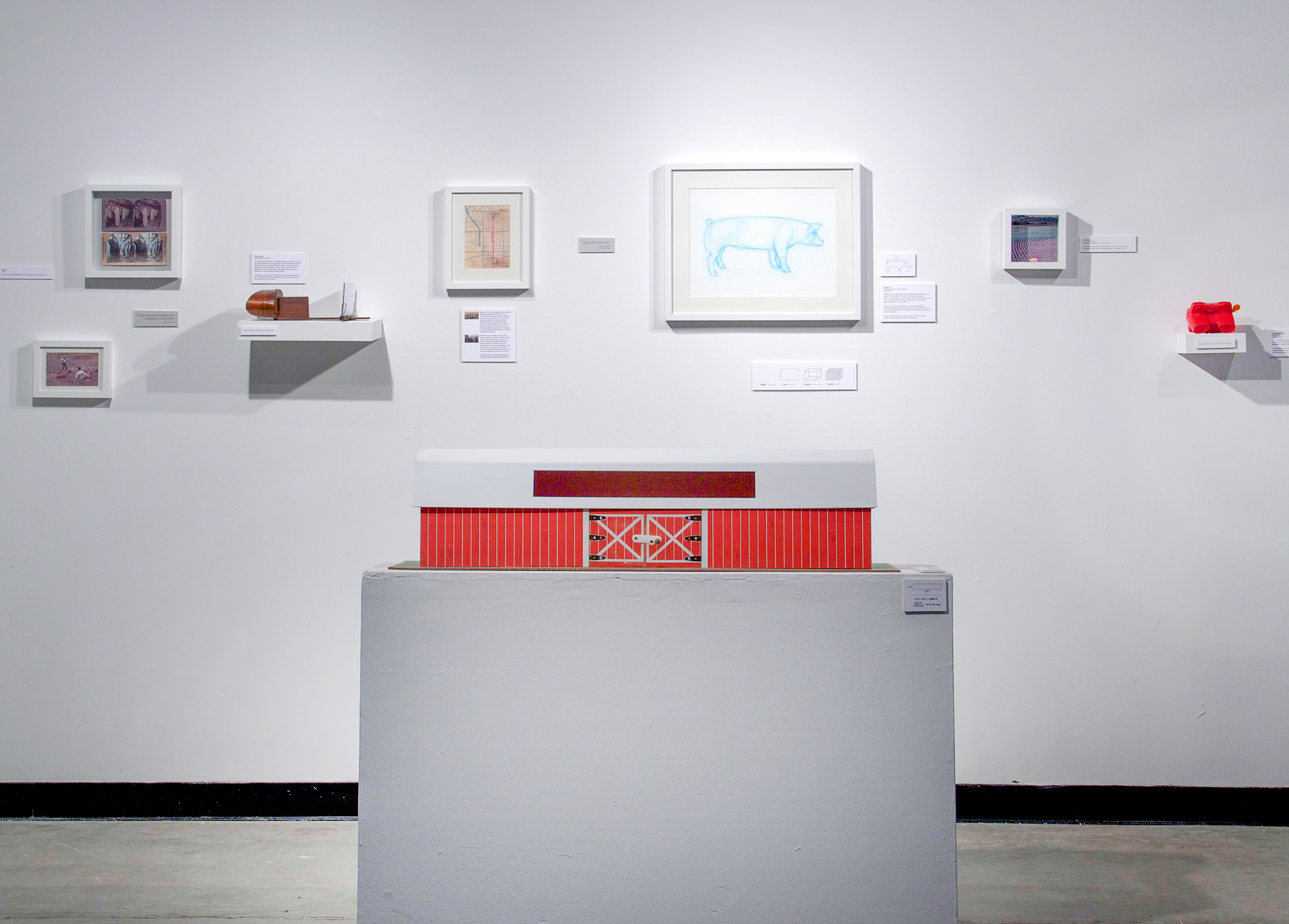 Antique stereoscope with stereoscopic images of dioramas illustrating methods of hog carcass disposal in incidences of "catastrophic mortality", Fisher Price Viewmaster toy, fabricated Fisher Price barn, 1000 plastic miniature hogs, inkjet prints of vintage stereoscopic image cards showing Chicago slaughterhouse facilities, map of Chicago stockyards, colored pencil schematic drawing of today's ideal hog, diagrams of simple mathematical equations for determining area, density, weight, volume, wall labels