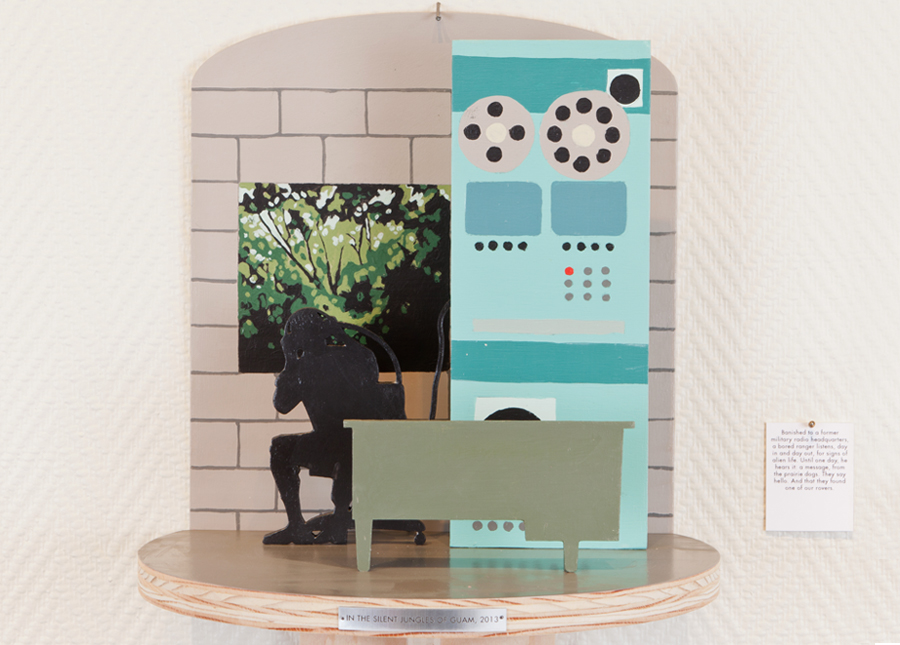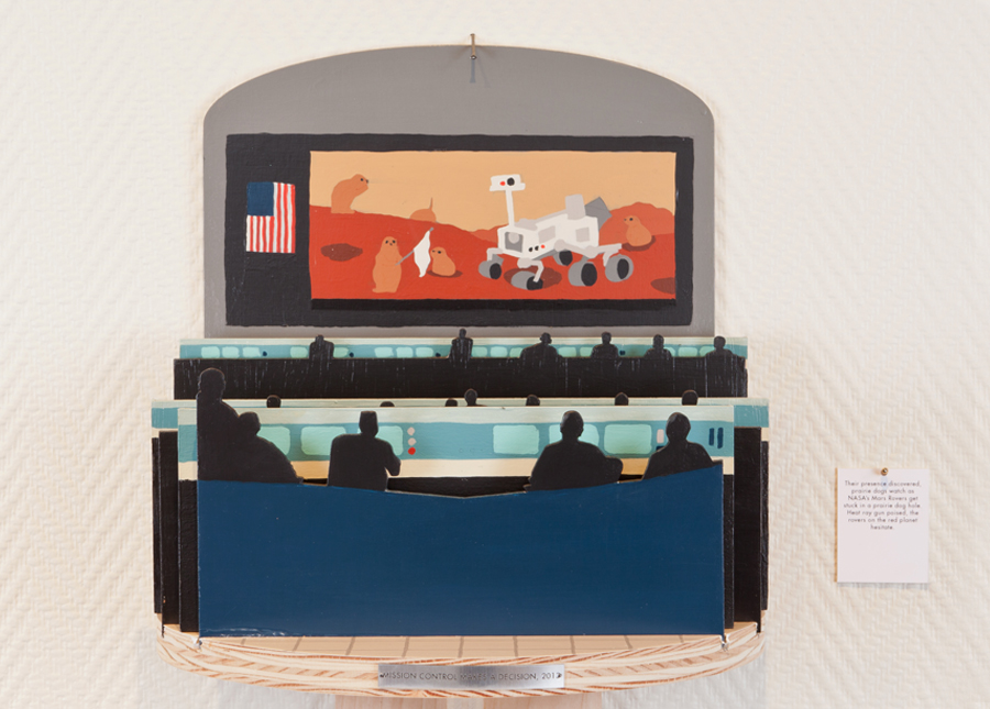 2013Borrowing from the genre of "invasion literature," this project imagines the much-persecuted prairie dog as a potential inter-planetary traveler. In this world, the war-like language of humans who feel embattled against this "pest" species is displaced to the planet named for the God of War. The narrative is told through a series of dioramas and accompanying captions, while a colony of prairie dogs listens intently to the War of the Worlds broadcast. Radio as a transmission across space emphasizes the importance of context in labeling a species as "pest" or "invader."